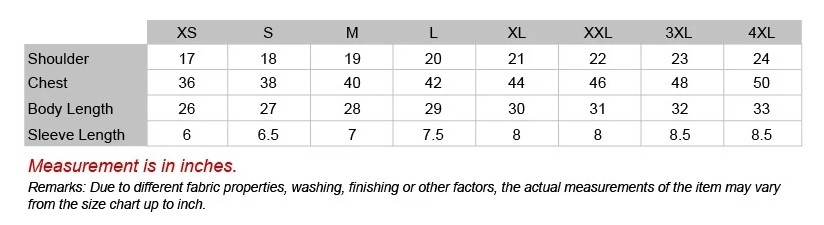 XS, S, M, L, XL, XXL, 3XL, 4XL